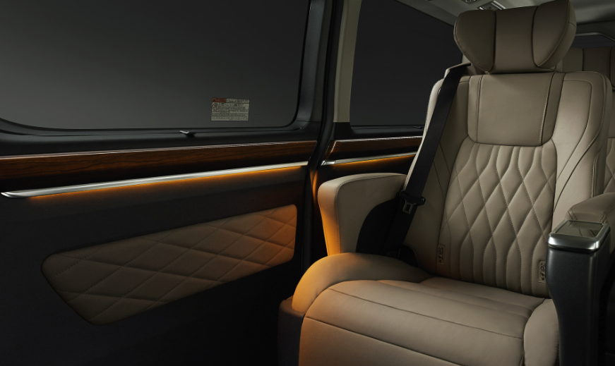 スライドドアトリムがPremiumグレードの場合、ステッチ付きのジルフィー表皮仕上げとなっています。エグゼクティブシートの背面と同じチェック柄で、車内の統一感・高級感をさらにアップさせてくれるパーツです。