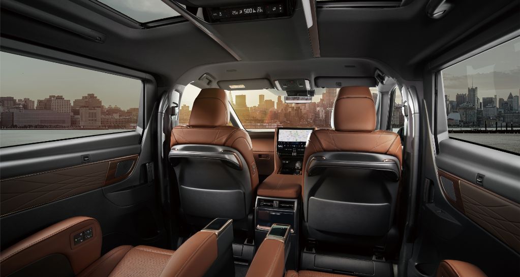 フロント2席+2列目独立キャプテンシート2席+3列目2席のレイアウトで、通路が広く3列目アクセスがスムーズです。2列目は電動スライド(最大480-500mm)、オットマン、リクライニング、シートヒーター/ベンチレーションを備え、本革張りで高級感があります。
